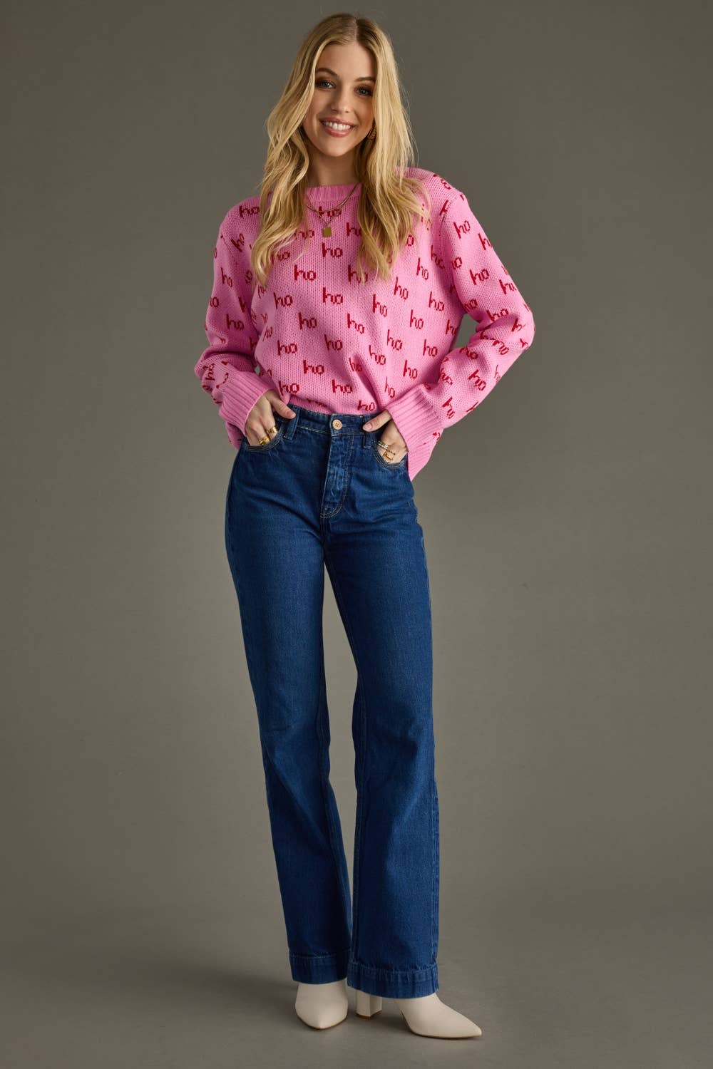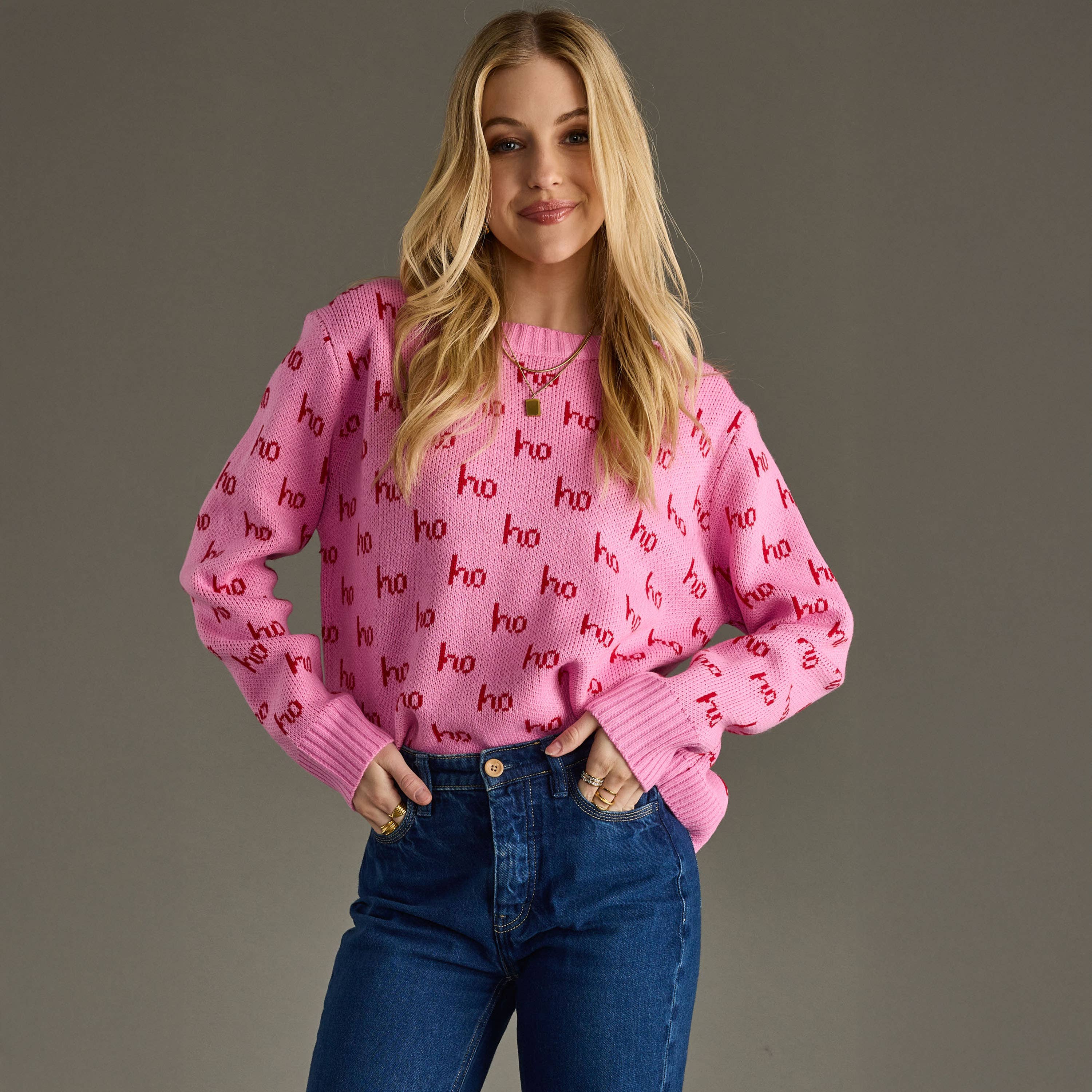 Pink knit sweater Red "ho ho ho" text on the front 100% Acrylic