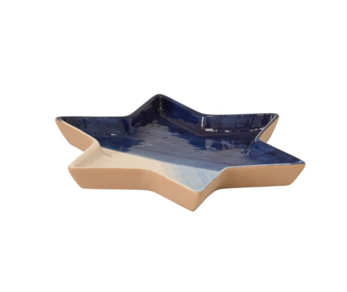 Bring the star of wonder and light to the table with the Magen Platter, perfect for Hanukkah celebrations & holiday gatherings. This Star of David shaped tray features a blue & white glossy handpainted interior & a textured natural clay exterior. This food-safe piece is ideal for serving treats & comes in 2 sizes for a coordinated tablescape.