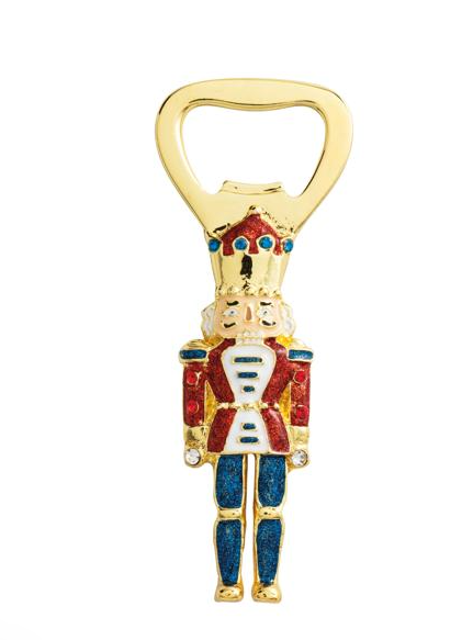 Nutcracker Bottle Opener is a charming and festive addition to your kitchen or barware collection. This delightful bottle opener features a sturdy metal construction, ensuring durability and ease of use for opening your favorite beverages. The handle is crafted in a whimsical gingerbread shape, adorned with glitter acrylic that adds a touch of sparkle and holiday cheer. Rhinestone details enhance its festive appeal, making it not only a functional tool but also a decorative piece that captures the spirit of the season. Measuring 4 1/4 inches, it is compact and easy to store, yet stylish enough to display. Perfect for holiday gatherings, parties, or as a thoughtful gift for friends and family who appreciate unique and playful kitchen accessories.