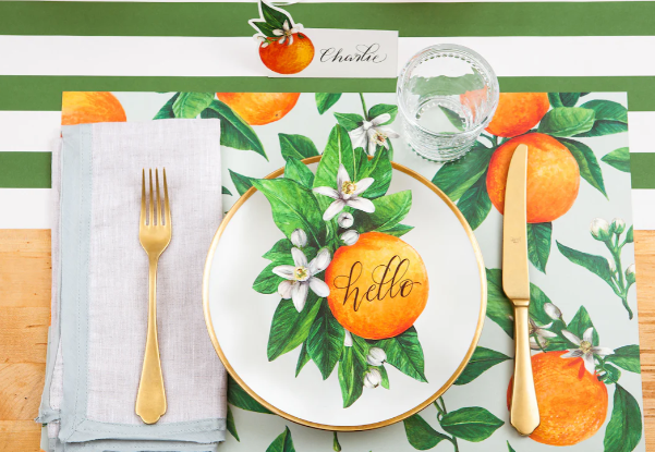 Citrus is a fresh way to brighten any table. Pair with seafoam, pink or dark green classic stripe table runners.