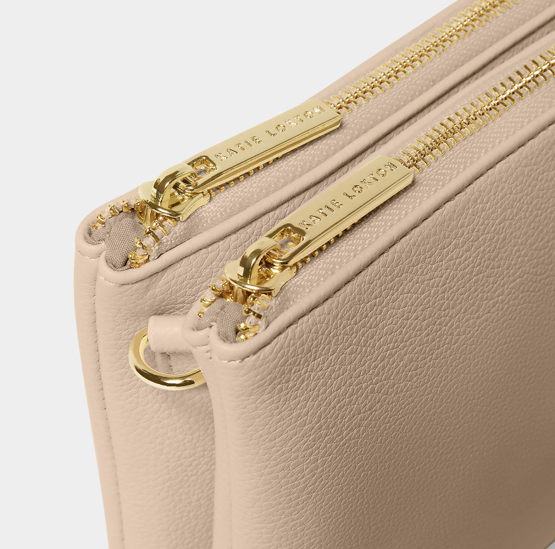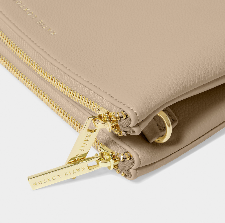 Meet the Duo Pouch in Light Taupe, a stylish and functional new addition to your wardrobe. Discover the new dual zip closure, with separate compartments for seamless organization - keeping your cards and coins on one side, and your phone and keys in the other! Carefully designed with soft vegan leather and accented with our iconic gold-tone hardware and branding, it adds a little luxury to any wardrobe. Plus, it's oh-so versatile with the attached D-ring, instantly turning it into a bag using our interchangeable Straps.