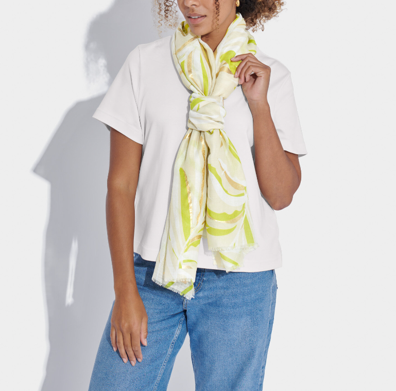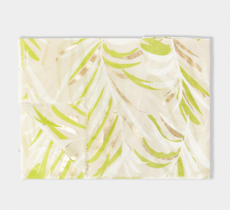 Stand out and shine bright with our brand-new Palm Leaf Foil Printed Scarf. This beautiful scarf features a lightweight design, perfect for year-round styling, shimmering gold foil metallic detailing, and a stylish frayed finish. Whether it's worn as a chic shawl, tied around your favorite handbag, or snugly draped around your neck, this versatile accessory is designed to be worn from this season to the next! Plus, don't forget to complete your order with one of our gorgeous. 100% Polyester