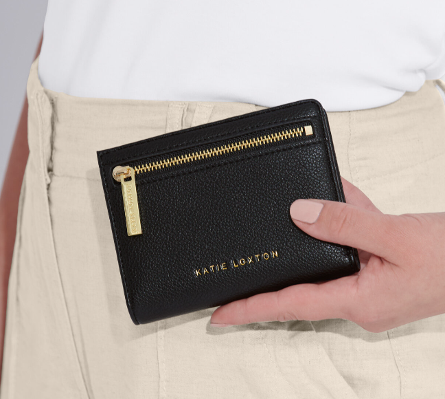The versatile Jayde Wallet in Black is designed to seamlessly slide into your favorite Katie Loxton bag, ensuring you're prepared to conquer every daily task. Carefully designed with soft vegan leather and adorned with our signature gold-tone hardware, this wallet is the perfect blend of fashion and functionality. Its zip front closure, numerous internal card slots, and dual zip pockets provide ample space for organizing keys, cards, cash, and other essentials. This design pairs flawlessly with our Jayde Backpack for a coordinated and stylish ensemble.