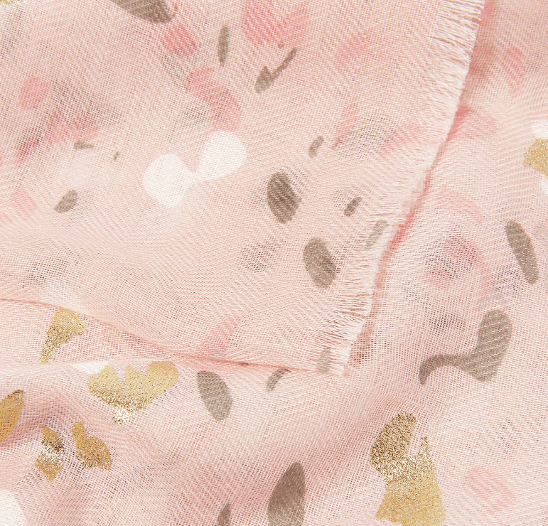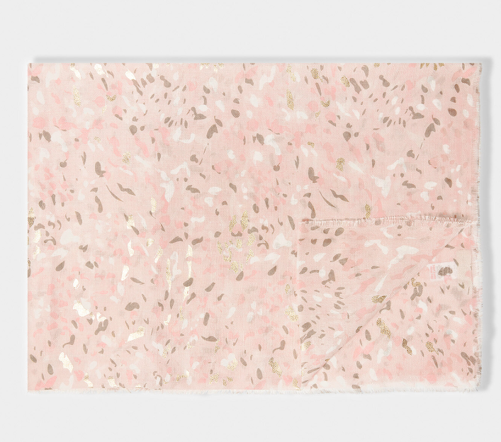 Stand out and shine bright with our brand-new Terazzo Foil Printed Scarf. This beautiful scarf features a lightweight design, perfect for year-round styling, shimmering gold foil metallic detailing, and a stylish frayed finish. Whether it's worn as a chic shawl, tied around your favorite handbag, or snugly draped around your neck, this versatile accessory is designed to be worn from this season to the next! Plus, don't forget to complete your order with one of our gorgeous. 100% Polyester