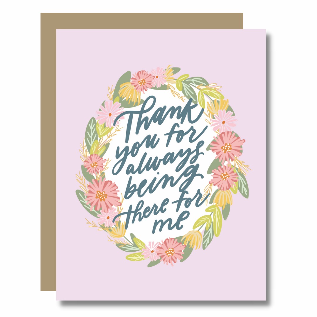 We all have moments when we need more help than we can offer. This greeting card is the perfect offer to someone who is always there, always looking out for you, always lending a hand, and always going the extra mile to support you. A thank you note for when "thank you" just isn't enough, this is the perfect addition to any card stash. "Thank you for always being there for me" within a hand-illustrated wreath. Digitally printed on #110 felted white stock. A2 card with final dimensions of 4.25" x 5.5" Packaged with a beige Kraft envelope in a clear cello sleeve. Blank on the inside.