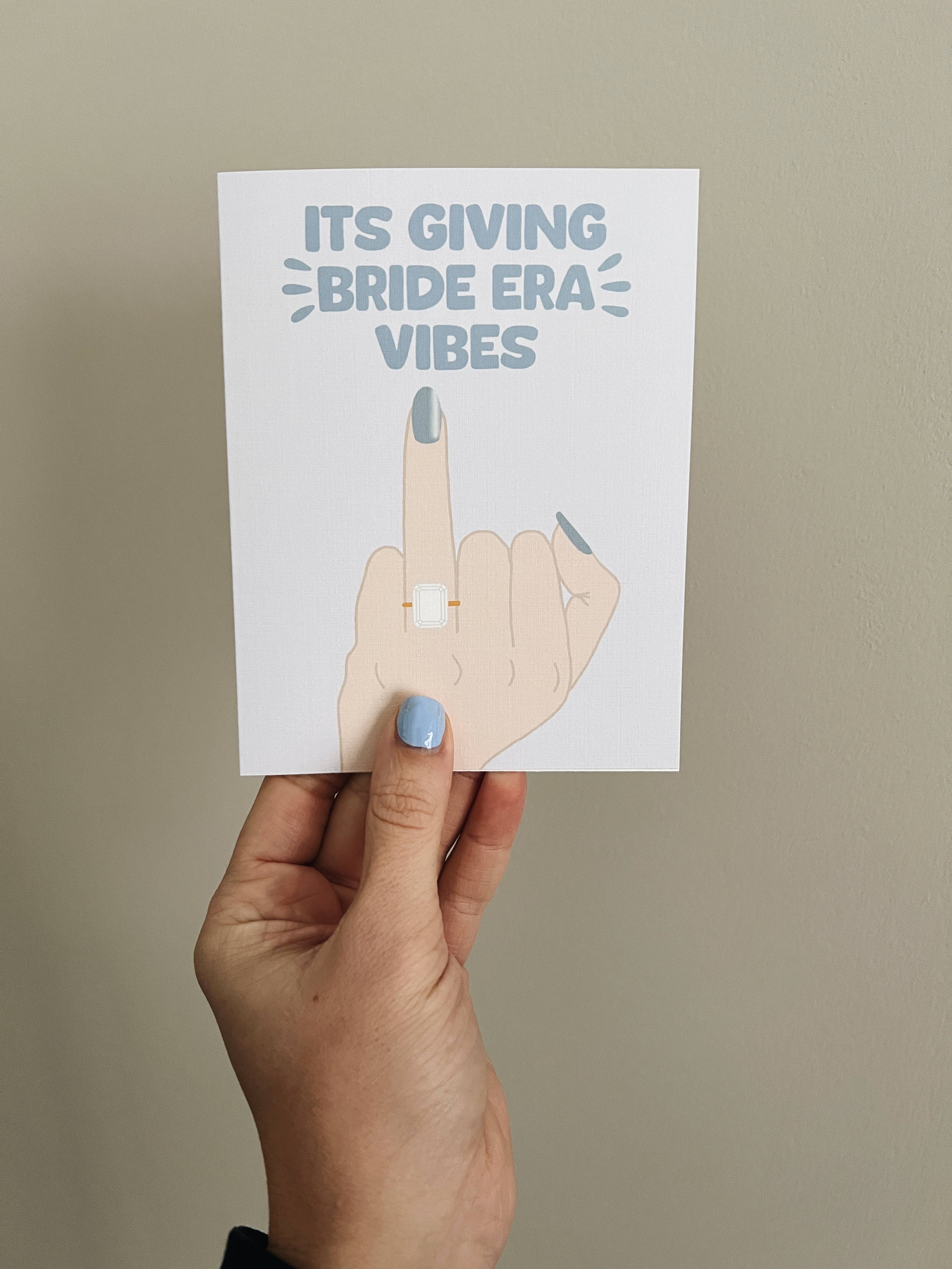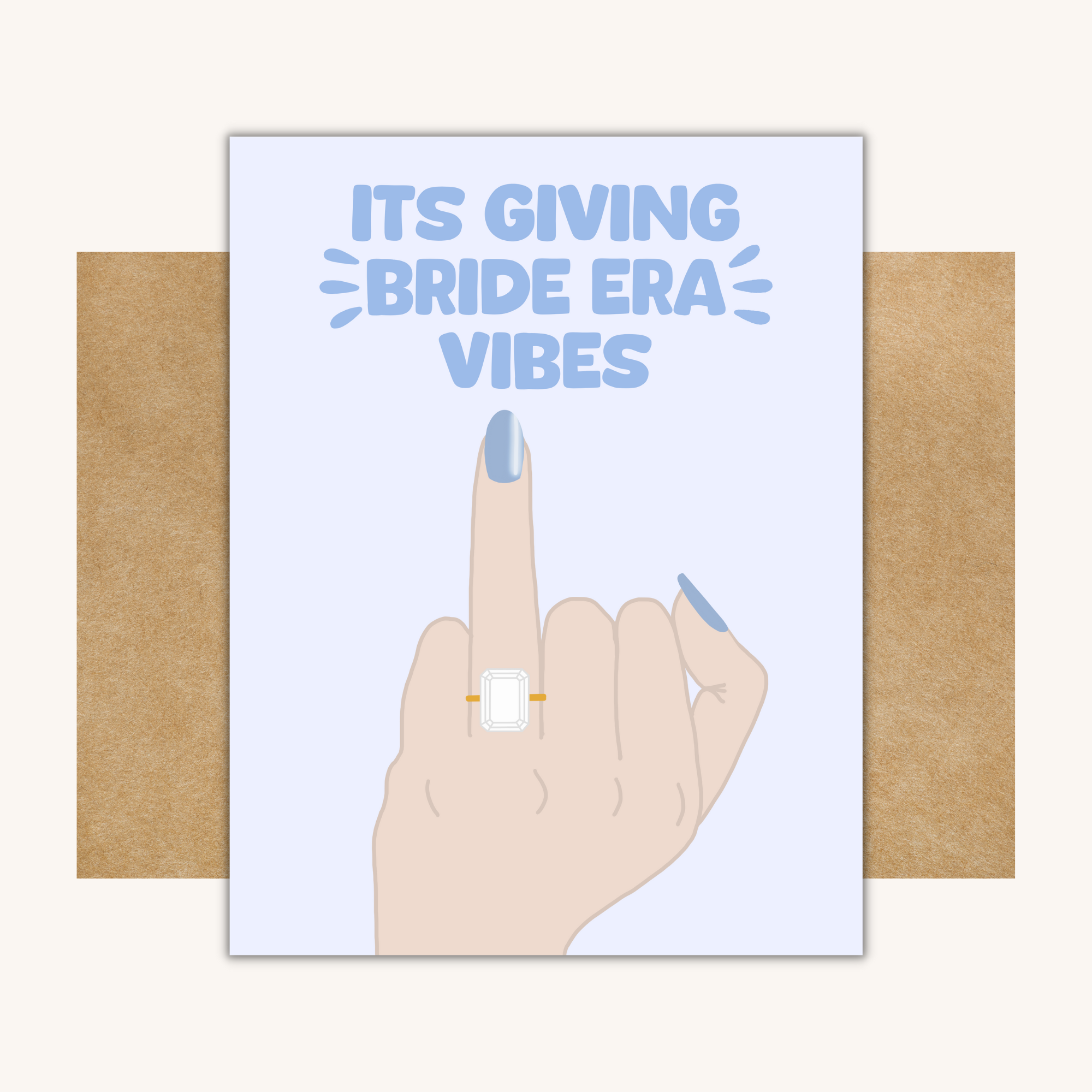 "It's Giving Bridal Era Vibes" Card is such a fun card for any bride! Dimensions: 5.5” x 4.25”. Made with high quality 100lb paper. Blank on inside. Comes with one Kraft envelope per card. Cards are all individually packaged in a clear cellophane sleeve.