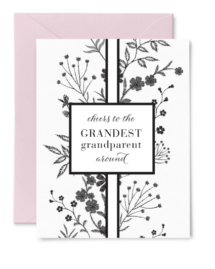 “Cheers to the Grandest Grandparent around” is a letterpress printed, folded A2 card that comes with coordinating envelope, blank inside