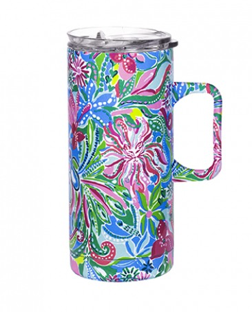 Stay hydrated on the go with a stylish Lilly stainless steel travel mug. Made of double walled stainless steel, this insulated tumbler holds 16 ounces and keeps drinks at the right temperature so you can sip in style no matter what. With a convenient carrying handle and spill-proof lid, this travel tumbler is up for any adventure.