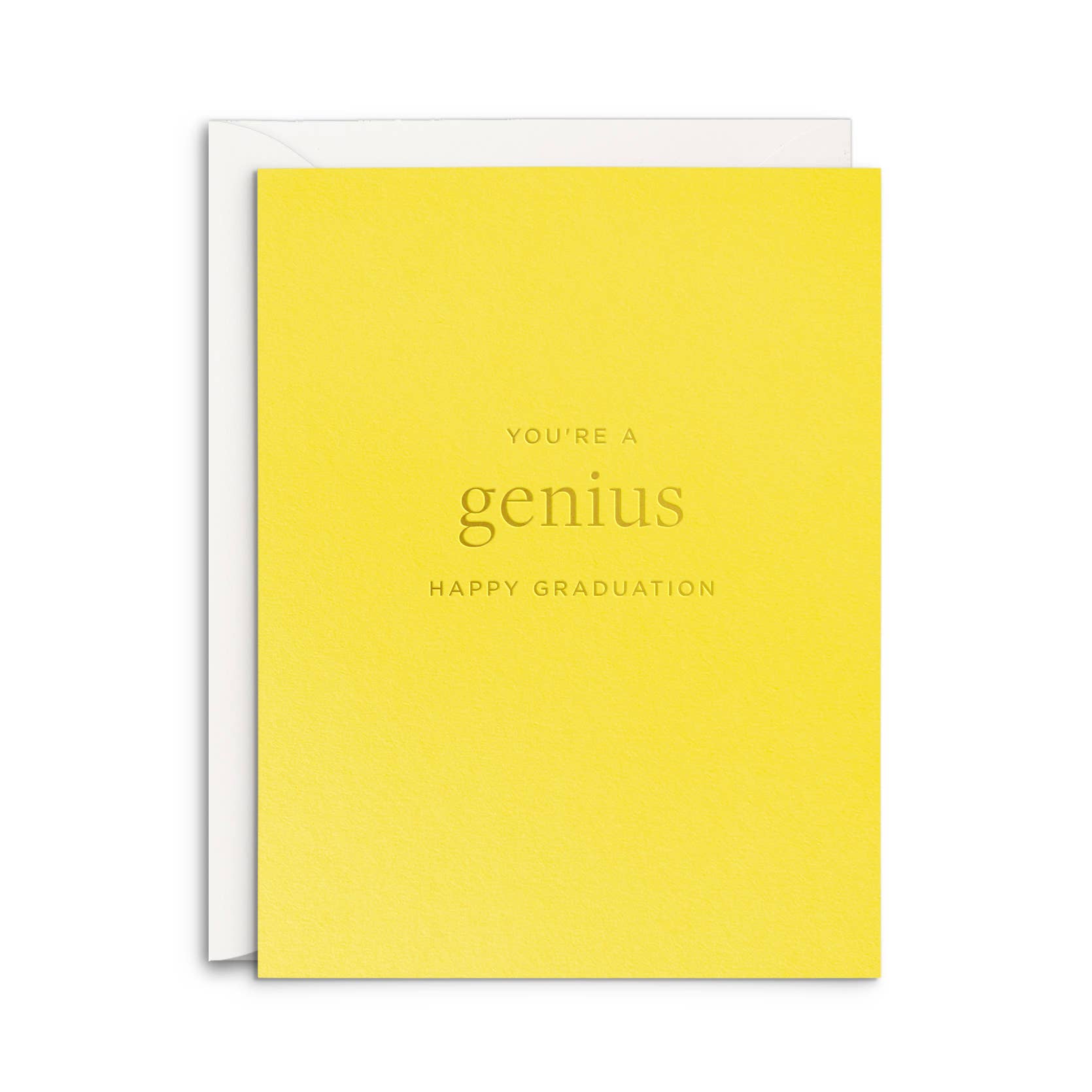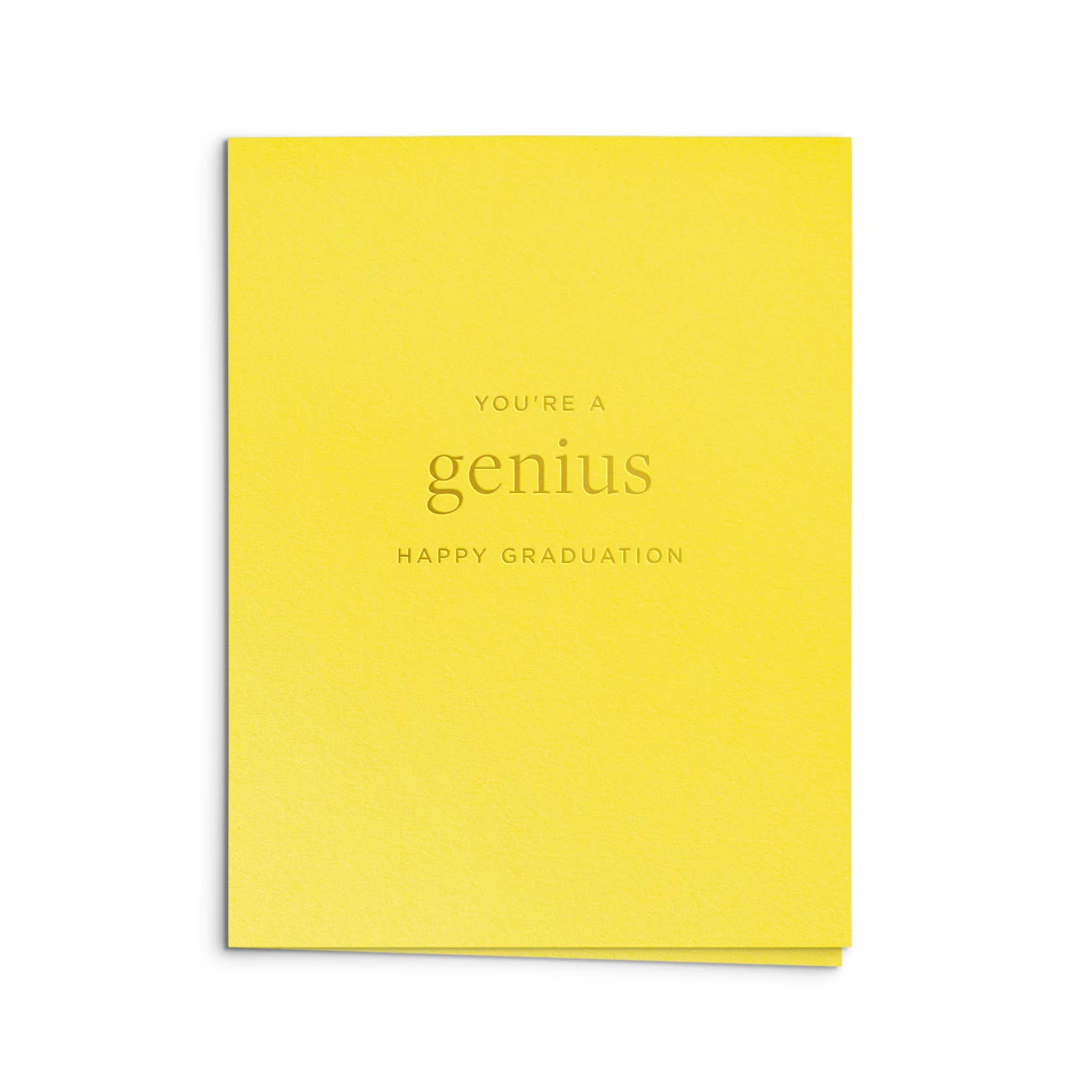 Our Genius Graduation card is printed with foil stamping on luxe heavyweight textured cardstock. Gold foil on bright yellow paper. For the smarty pants graduate. We print all greeting cards at our in house print shop on traditional letterpress machinery. Folded card with blank interior and envelope. Designed and Printed in the USA.