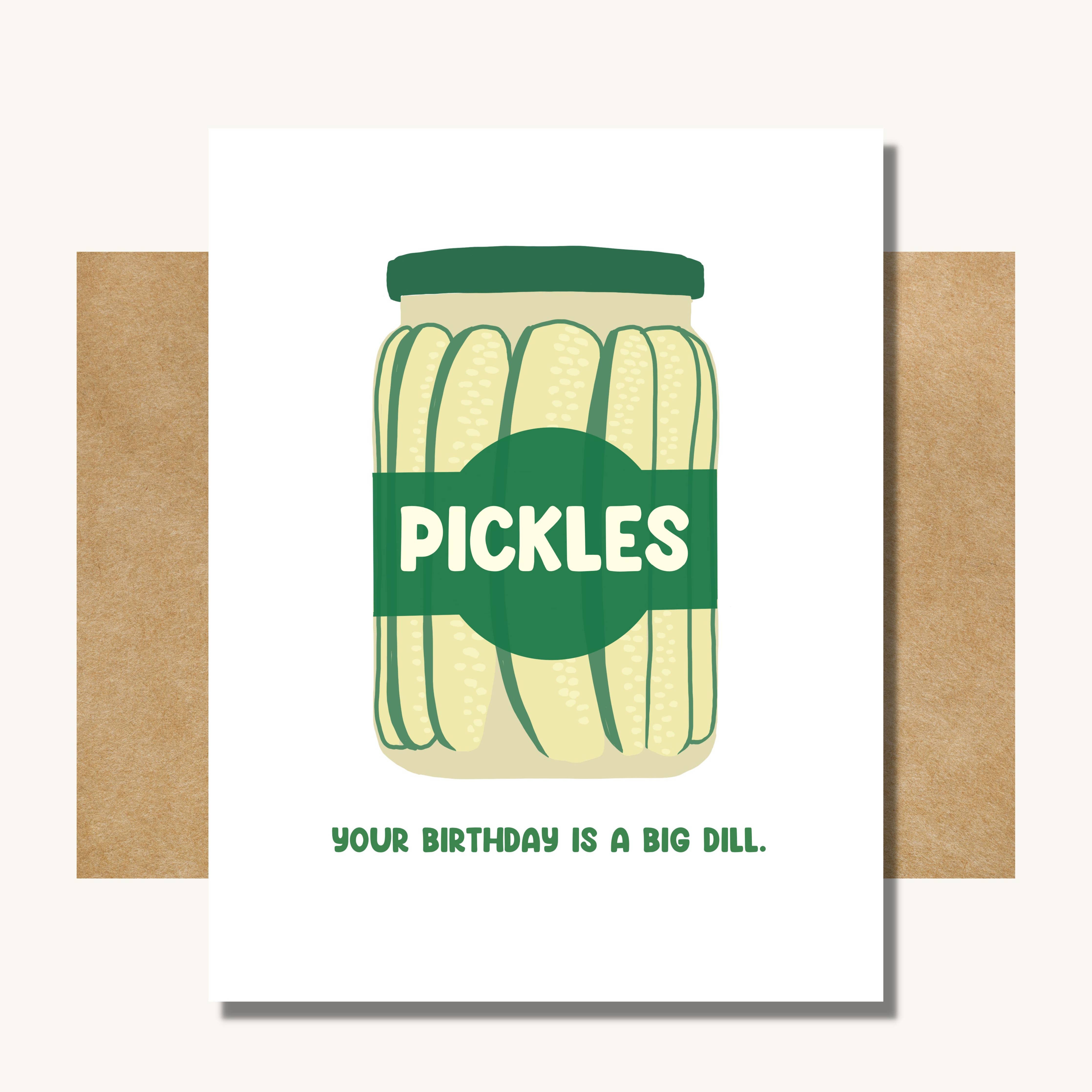 The perfect birthday card for any pickle fan! Dimensions: 5.5” x 4.25”. Made with high quality 80lb paper. Blank on inside. Comes with one Kraft envelope per card.