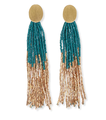 Mae Oval Brass Post 2-Color Beaded Tassel Earrings are elegant post earrings made with precision-cut luxe glass beads. They feature a beautiful ivory color and are crafted from brass and glass materials. Perfect for both casual and formal occasions, they bring a pop of color and a hint of bohemian flair to any outfit. Let your style be BOLD and make a statement with these exquisite and enchanting earrings.
