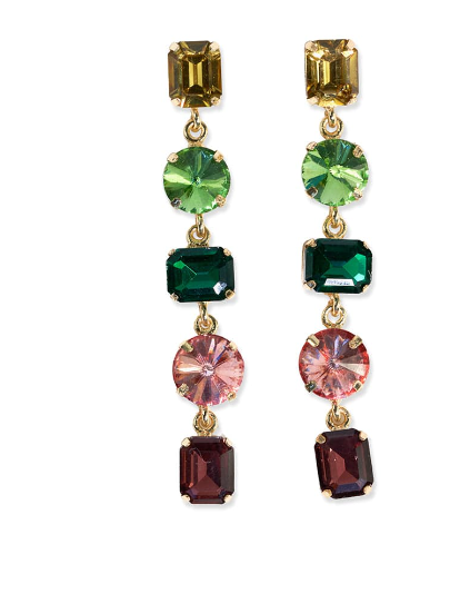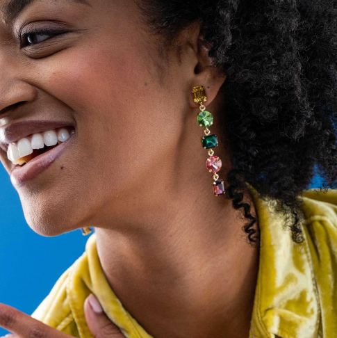 Make a bold and vibrant statement with the Prism Priscilla 5-Tier Mixed Stones Drop Earrings in a stunning rainbow colorway. These exquisite drop earrings feature five tiers of rainbow prism stones that beautifully catch the light with every movement. Let the kaleidoscope of colors in these earrings reflect your vibrant and joyful spirit; they're sure to elevate any outfit, whether you're dressing them up with a LBD, or down with a denim jumpsuit.