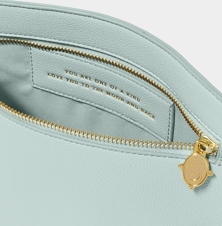 Introducing our Keepsake Charm Pouches, carefully designed to hold memories for years to come. Featuring the softest vegan leather in the sophisticated shade of Light Duck Egg, and adorned with our signature gold-tone hardware and a charming zip pull, seamlessly blending both luxury and aspiration. The pouch comes complete with a click-on sentiment tag with the uplifting quote 'You Are One Of A Kind, Love You To The Moon And Back' which can be easily be attached or detached depending on your personal style and occasion. Nestled within the pouch's interior is a secret message, ready to surprise and delight the wearer.