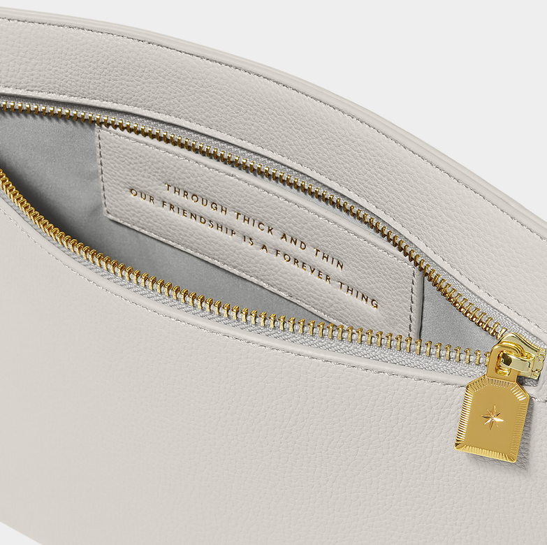 Introducing our Keepsake Charm Pouches, carefully designed to hold memories for years to come. Featuring the softest vegan leather in the sophisticated shade of Plae Grey, and adorned with our signature gold-tone hardware and a charming zip pull, seamlessly blending both luxury and aspiration. The pouch comes complete with a click-on sentiment tag with the uplifting quote 'Through thick and thin our friendship a forever thing' which can be easily be attached or detached depending on your personal style and occasion. Nestled within the pouch's interior is a secret message, ready to surprise and delight the wearer.