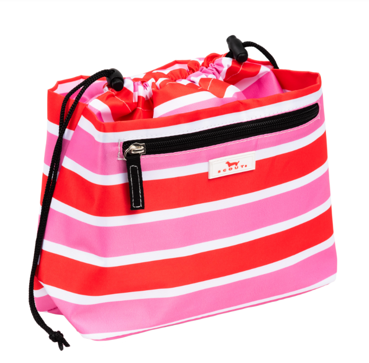 BEAUTY ON DEMAND. With pockets galore, The Glam Squad lives to contain it all: makeup brushes and palettes, mascara, lipstick, hair products, and more. Keep the things you use the most in the exterior compartments, and smaller items safe inside by cinching the drawstring shut. Perfect vanity organizer; stands on its own to keep items from spilling.