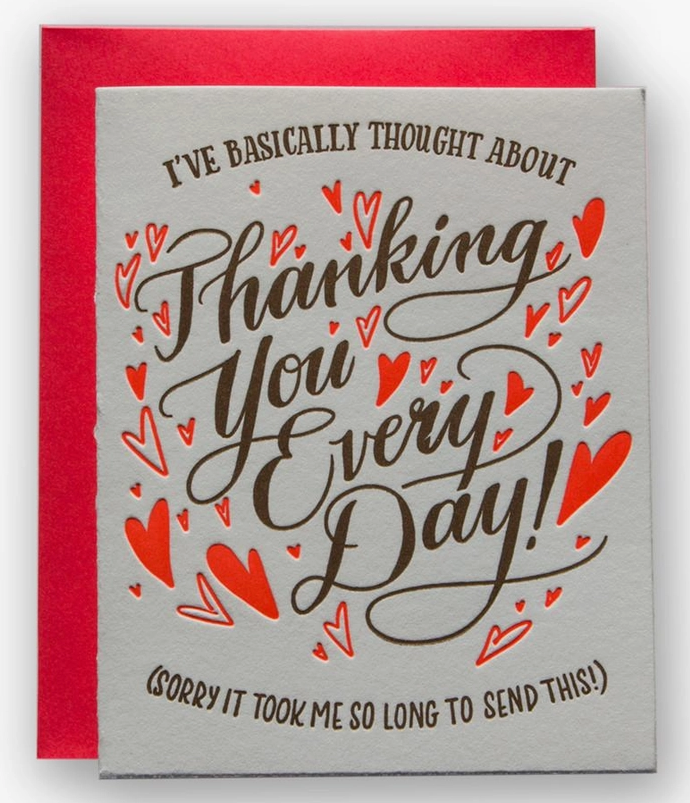 Chronic late thank you card sender? Let them know that you're not a derelict, you really *have* had them on your mind! Letterpress printed A2 size with a blank interior.