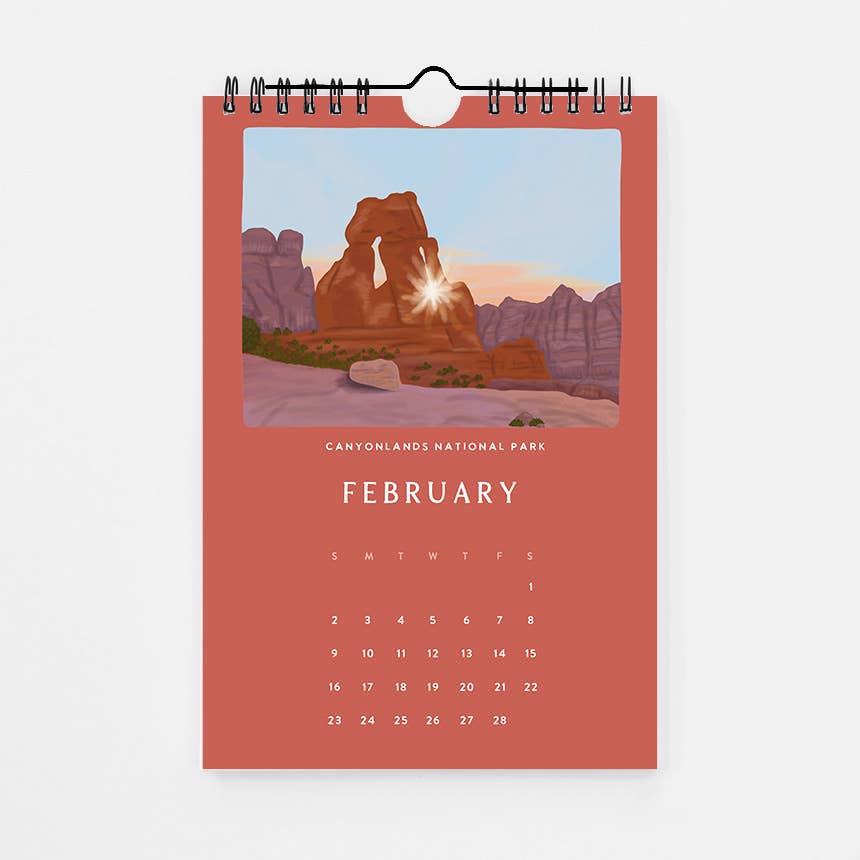 2025 Mini National Parks Calendar! Our mini calendars are gorgeously illustrated and designed to ignite wanderlust for your upcoming adventures. Each 6"x9" calendar is printed in full color on thick, luxe natural stock and is wire-o bound with a calendar hanger for easy wall, bulletin board, or fridge magnet hanging.