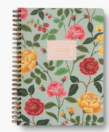 Our softcover spiral planner features a textured paper cover with a full-color floral design and a gold foil year. The weekly view includes a full page for notes and lists on every spread. In addition, there are sections for monthly views, contacts, goals, and pockets for storage.