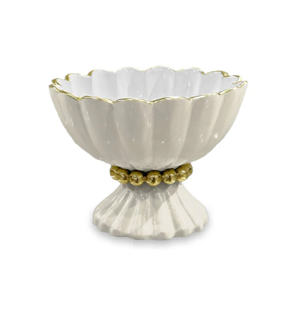 Instead of cookie-cutter, copy-and-paste interiors, people are embracing spaces that reflect their unique personalities and seeking objects with stories and character.With a vintage “found” look, here’s a dazzling design transformed by contemporary color and brilliant touches of gold.Beatriz Ball continues to innovate and add new finishes and techniques to her handmade offerings with the multicolored ENCANTO Collection--incorporating vibrant enameled colors and gold details. Layered, exuberant and rich in color, this beautiful assortment was designed with a versatility that ensures that every occasion is a celebration.With its stunning two-toned enameled finish and touches of gold, the ENCANTO Vienna Mini Pedestal with Spoon (Cream and White) is a beautiful marriage of timeless design and enchanting Encanto colors.Beautifully fluted surfaces and gold details are classic design elements that make this piece a reflection of the past, but relevant and appealing for today. Perched atop a gorgeous base, the mini pedestal bowl with gold spoon has a sensuous feel that proves that the small things make all the difference. Ideal for serving your favorite dips, sauces and salsas.A gift for all seasons.Beatriz Ball’s intensely handmade products use eco-friendly and sustainable materials and are crafted by artisans who trace a heritage of metalworking for generations. Made of a top quality, easy-care, aluminum alloy with a food-safe enamel finish. Dishwasher safe.